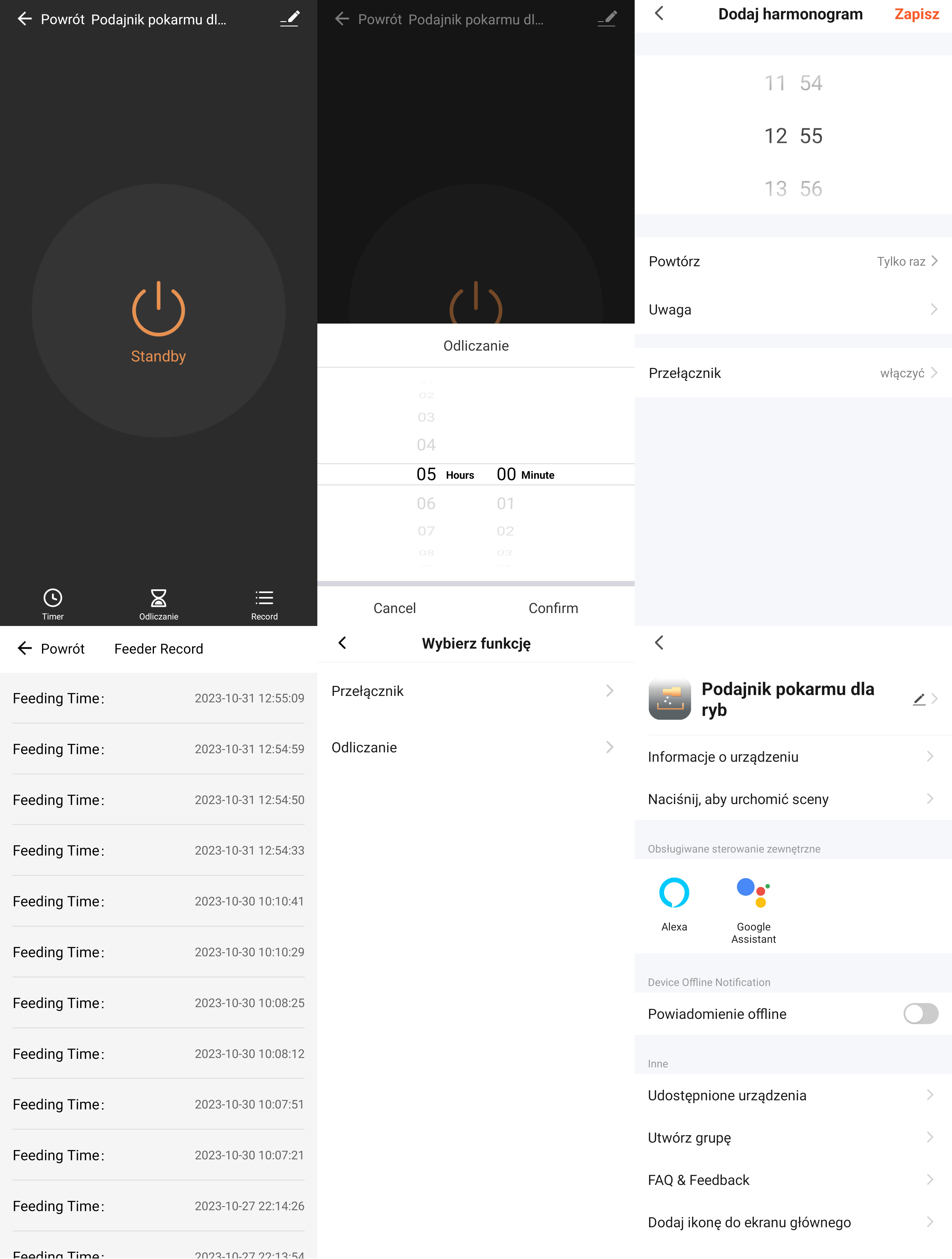 - Możliwość ustawienia harmonogramów automatycznego podawania pokarmu