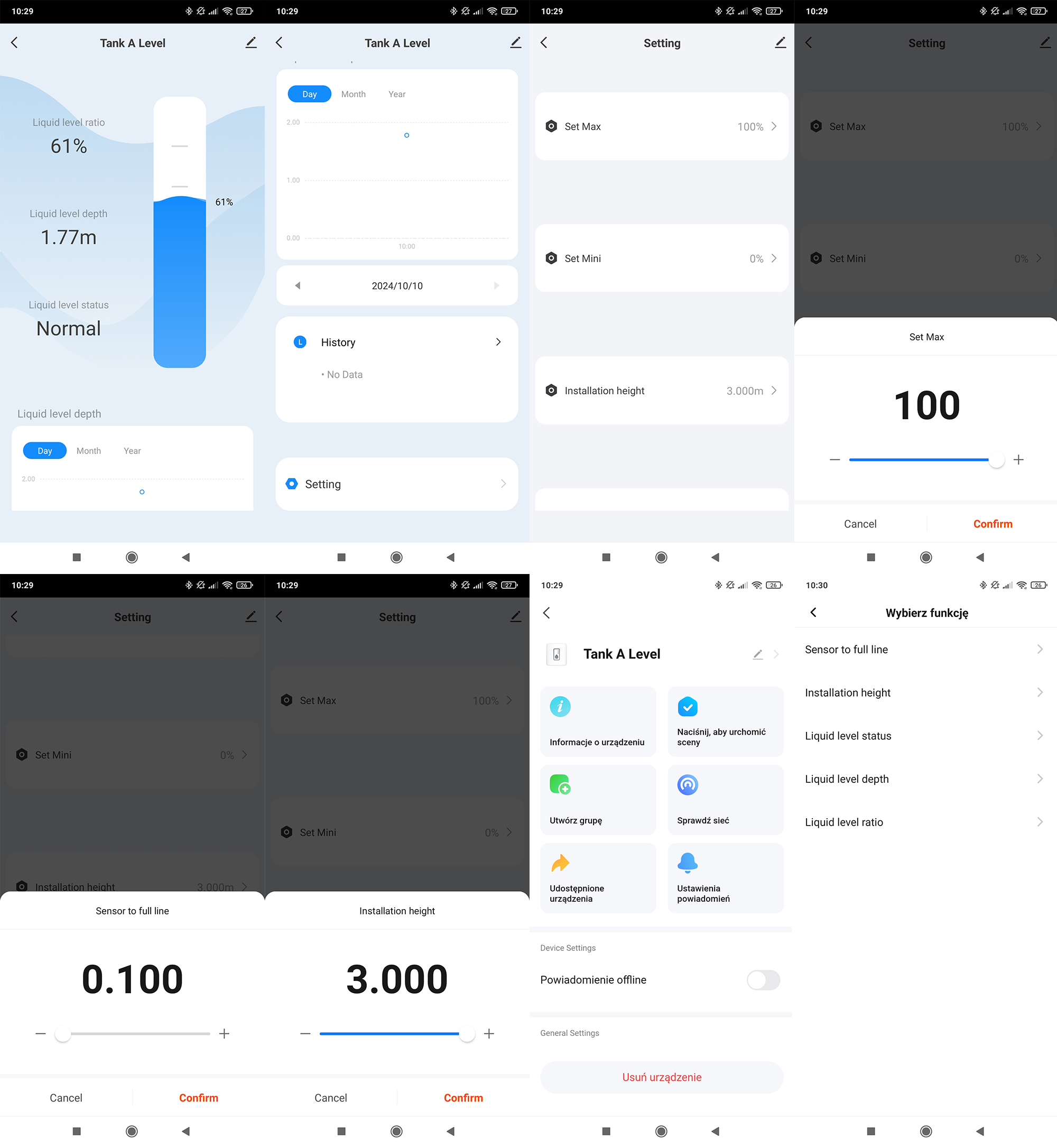 Użytkownik może ustalić maksymalny / minimalny poziom cieczy w aplikacji. Gdy próg cieczy zostanie przekroczony, system zareaguje i natychmiast powiadomi użytkownika, aby zapobiec przepełnieniu lub całkowitemu wyschnięciu.
