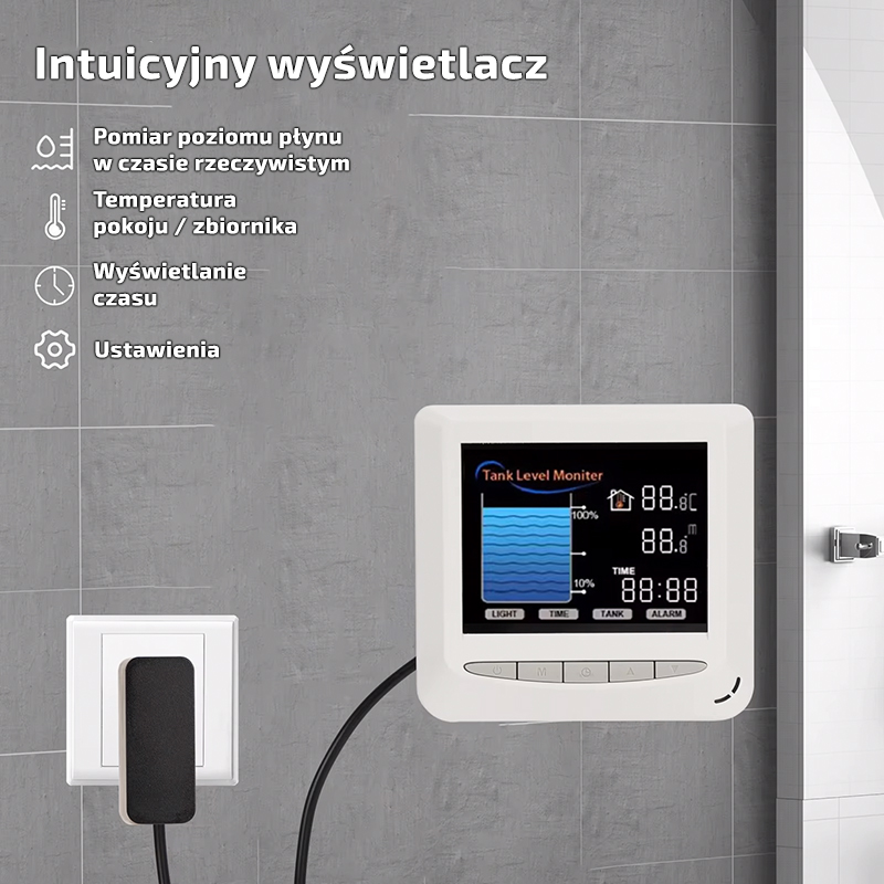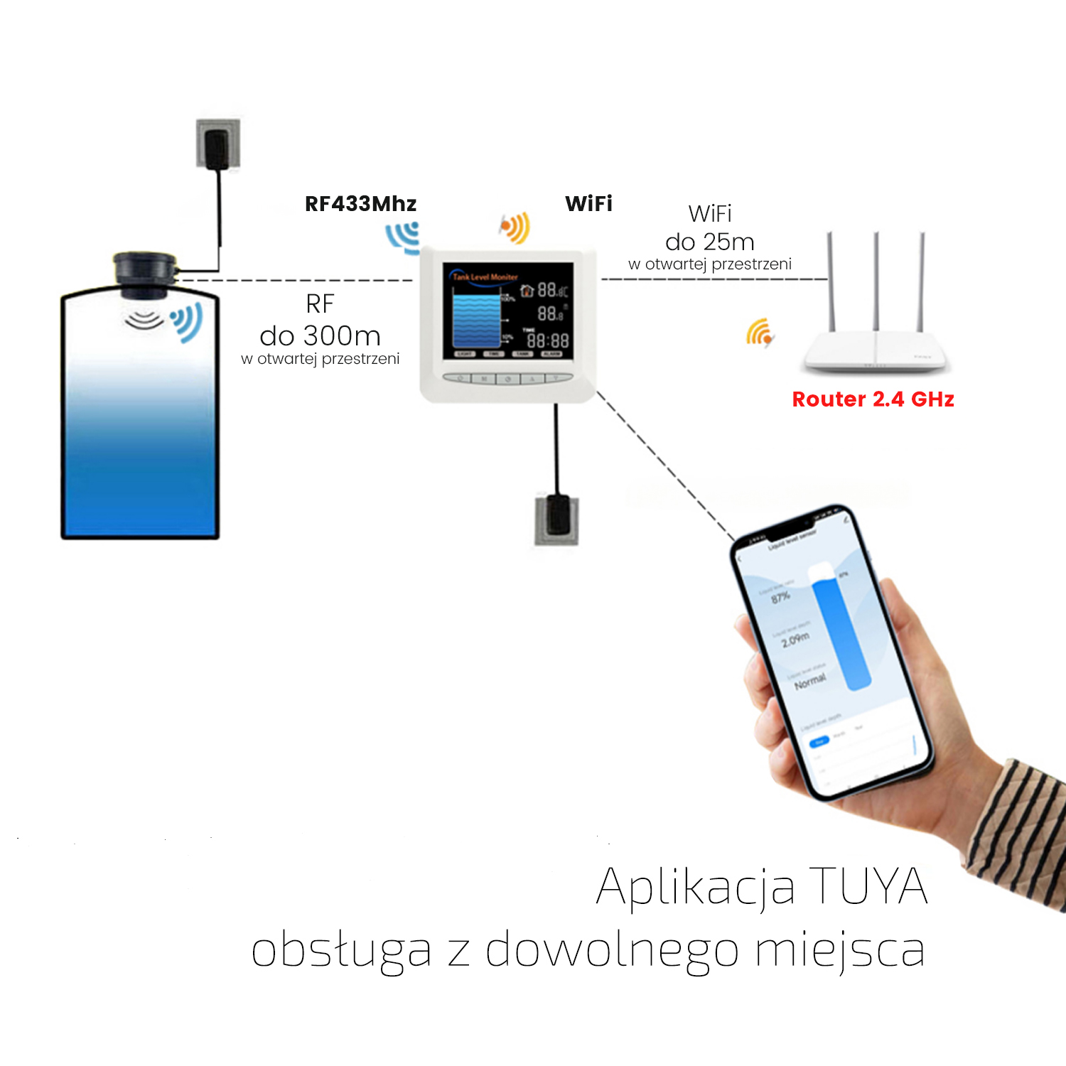 Jest to wersja z dodatkowym ekranem RF433MHz, który pokazuje poziom cieczy bez potrzeby wchodzenia w aplikację.