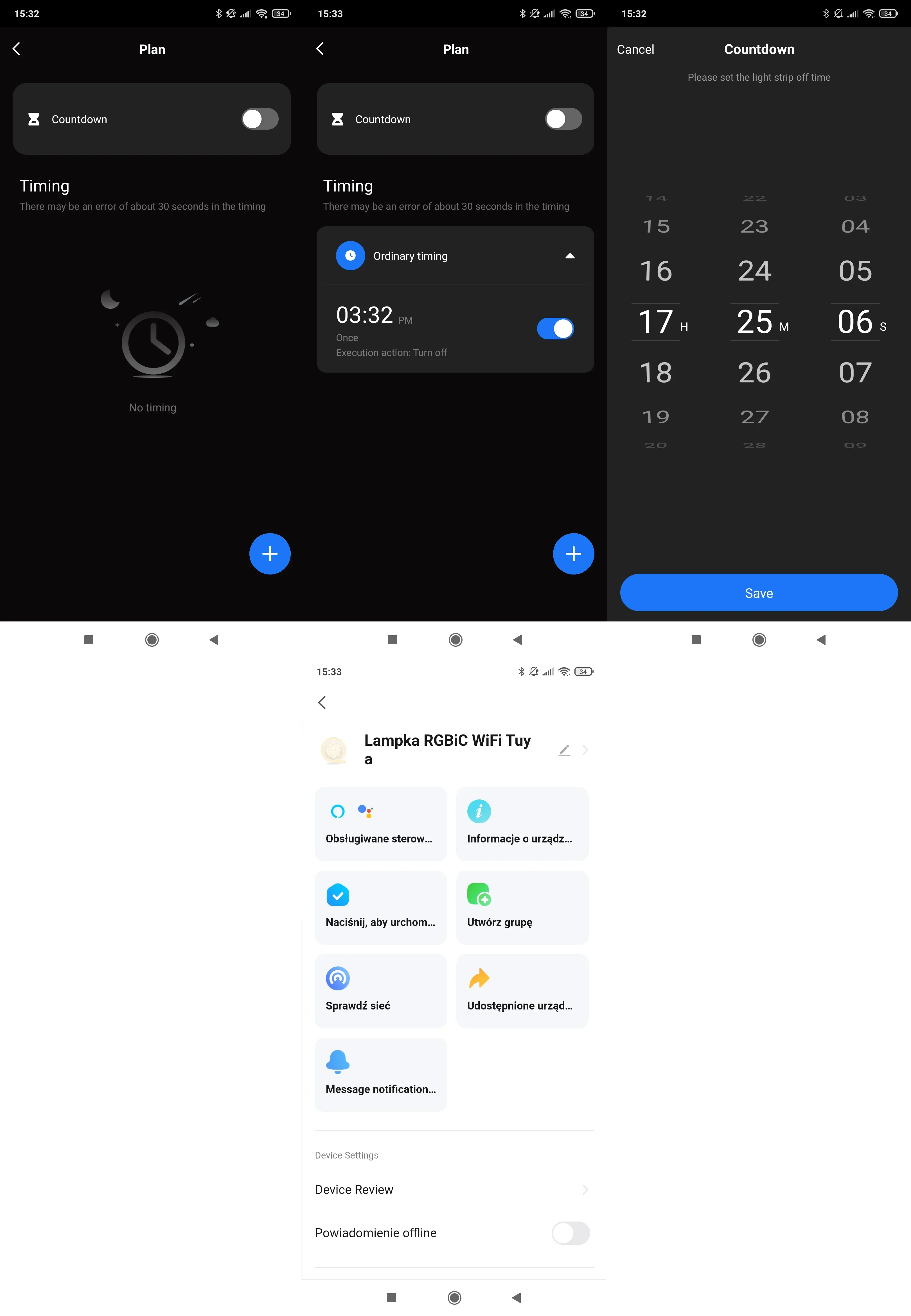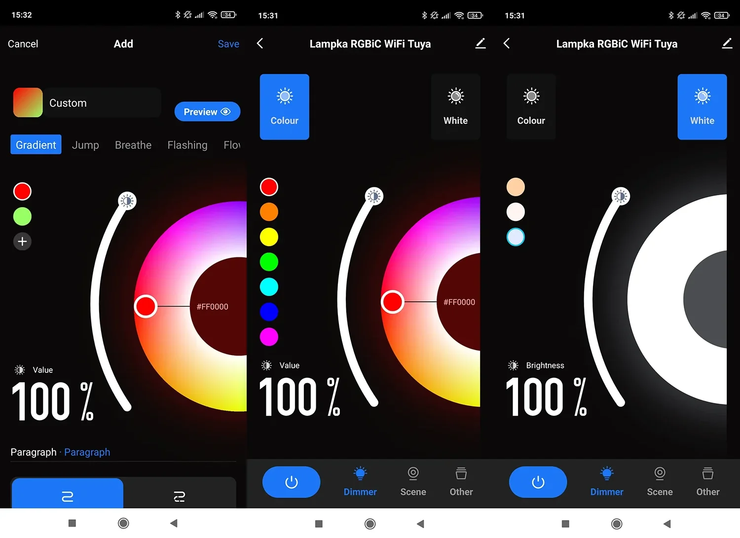 ✅ Z poziomu aplikacji możemy sterować włączaniem/wyłączaniem, kolorami, barwą koloru białego, jasnością, wyborem scen oraz ustawianiem harmonogramów pracy urządzenia