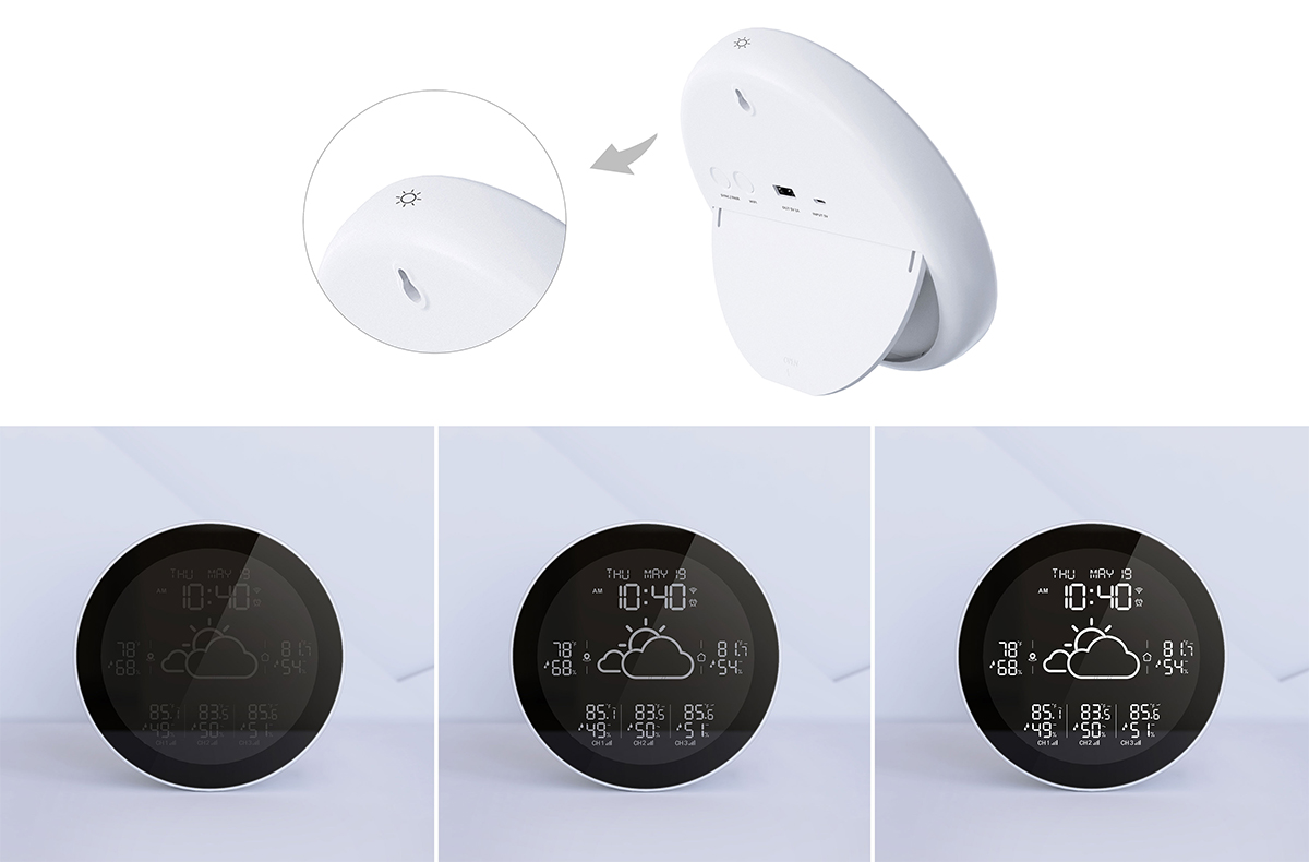 - Urządzenie połączone jest z Google Weather, dzięki czemu pokazuje prognozę pogody w czasie rzeczywistym