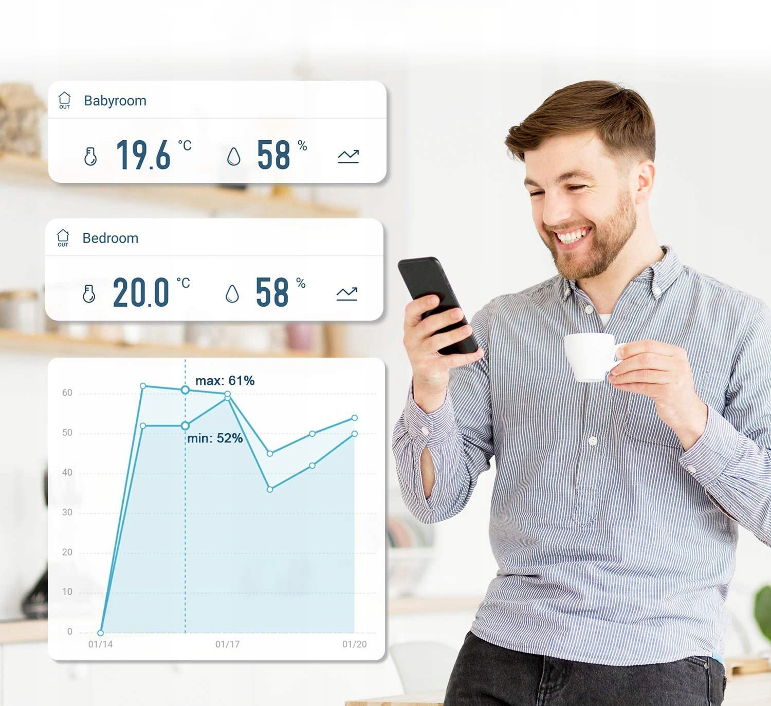- Możliwość sprawdzania historii temperatur i wilgotności, które prezentowane są za pomocą wygodnych w odczycie wykresów