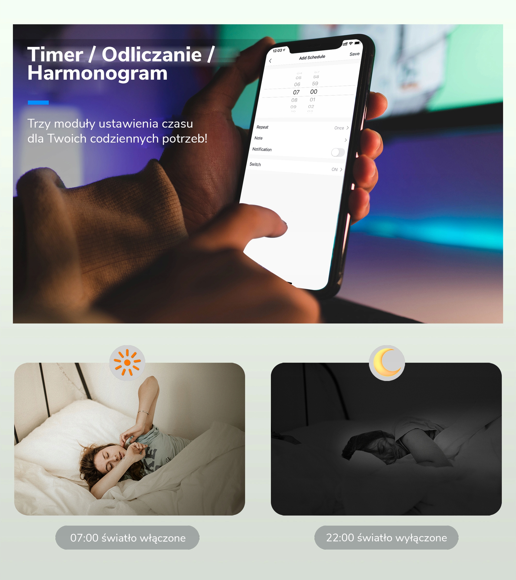 ➡️ Funkcje czasowe: Korzystaj z funkcji pomiaru czasu, odliczania i ustawiaj indywidualny harmonogram włączania i wyłączania światła.