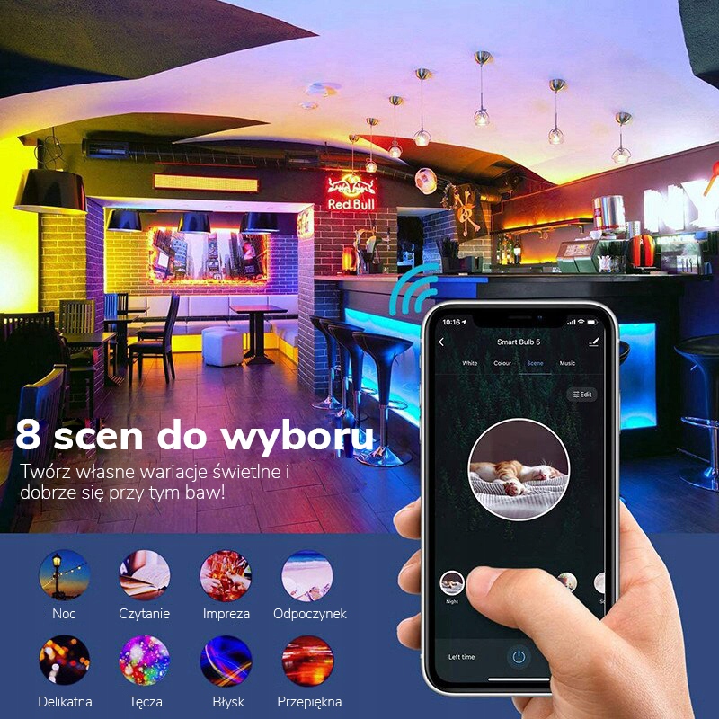 Żarówka WiFi oferuje do wyboru aż 8 różnych scen, w zależności od tego, czego aktualnie od niej oczekujesz. Możesz użyć światła jaskrawego, bardzo kolorowego, jeżeli organizujesz imprezę, lub światła spokojnego, delikatnego, które pomoże Ci w chwilach relaksu. Wszystko w zależności od nastroju i zapotrzebowania.