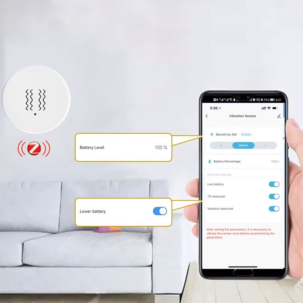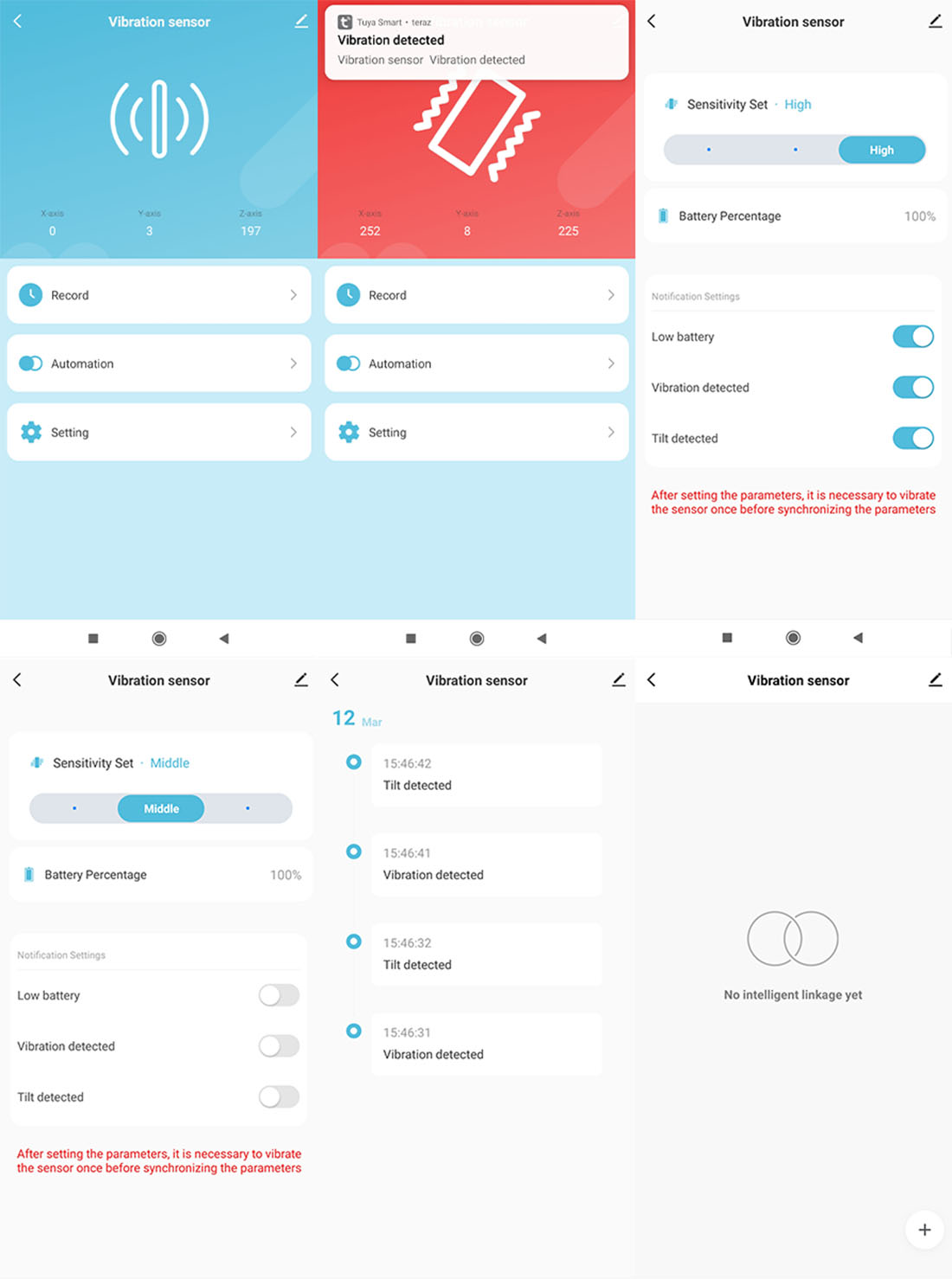 Czujnik wibracji z aplikacją Tuya na smartfony (Android/iOS) umożliwia szybką regulację czułości.