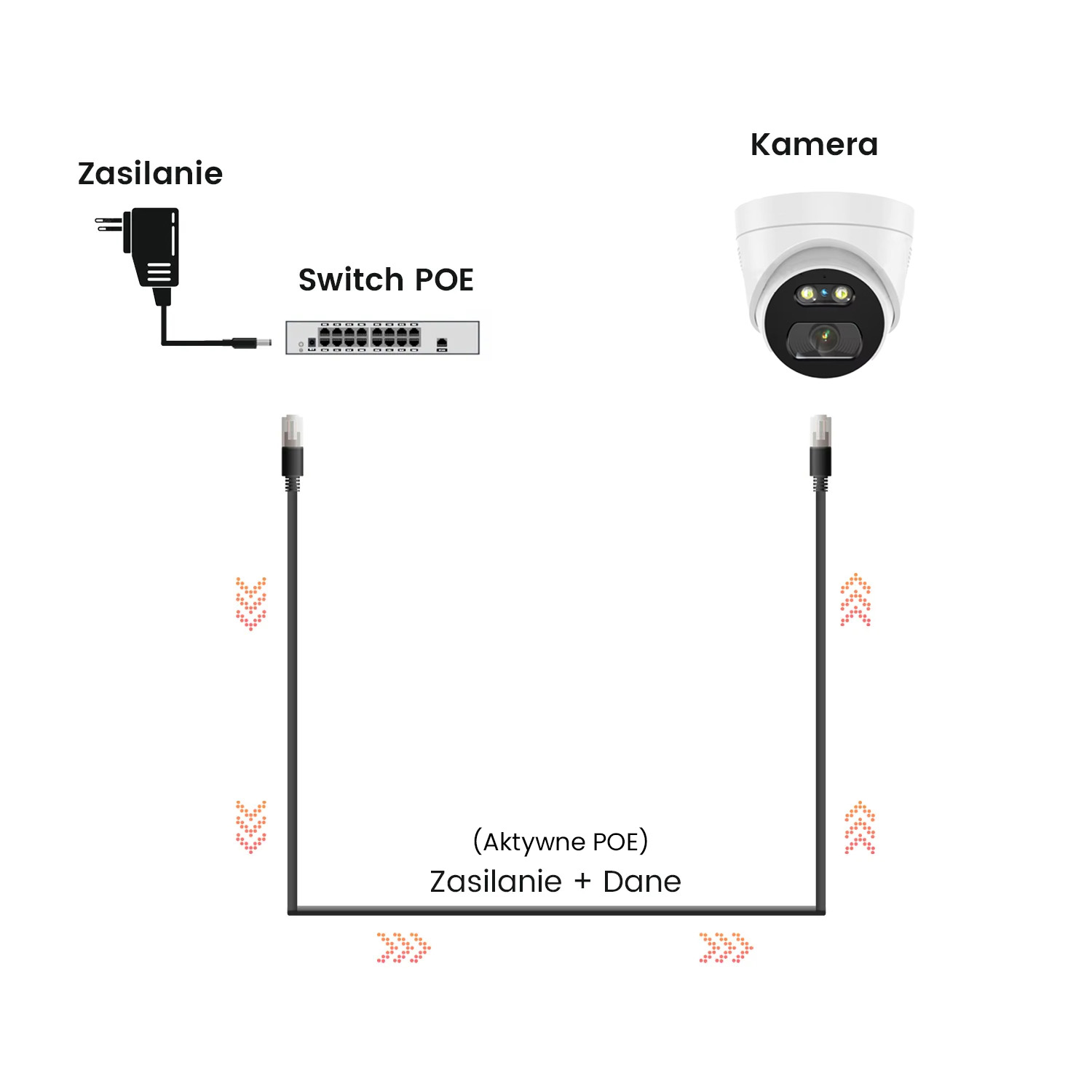 Funkcja aktywnego PoE (Power over Ethernet) umożliwia zasilanie poprzez tzw. skrętkę od switcha PoE, która przesyła dane monitoringu do podłączonych urządzeń. Nie potrzebujemy do tego dodatkowych adapterów jak w przypadku kamer 12 V.