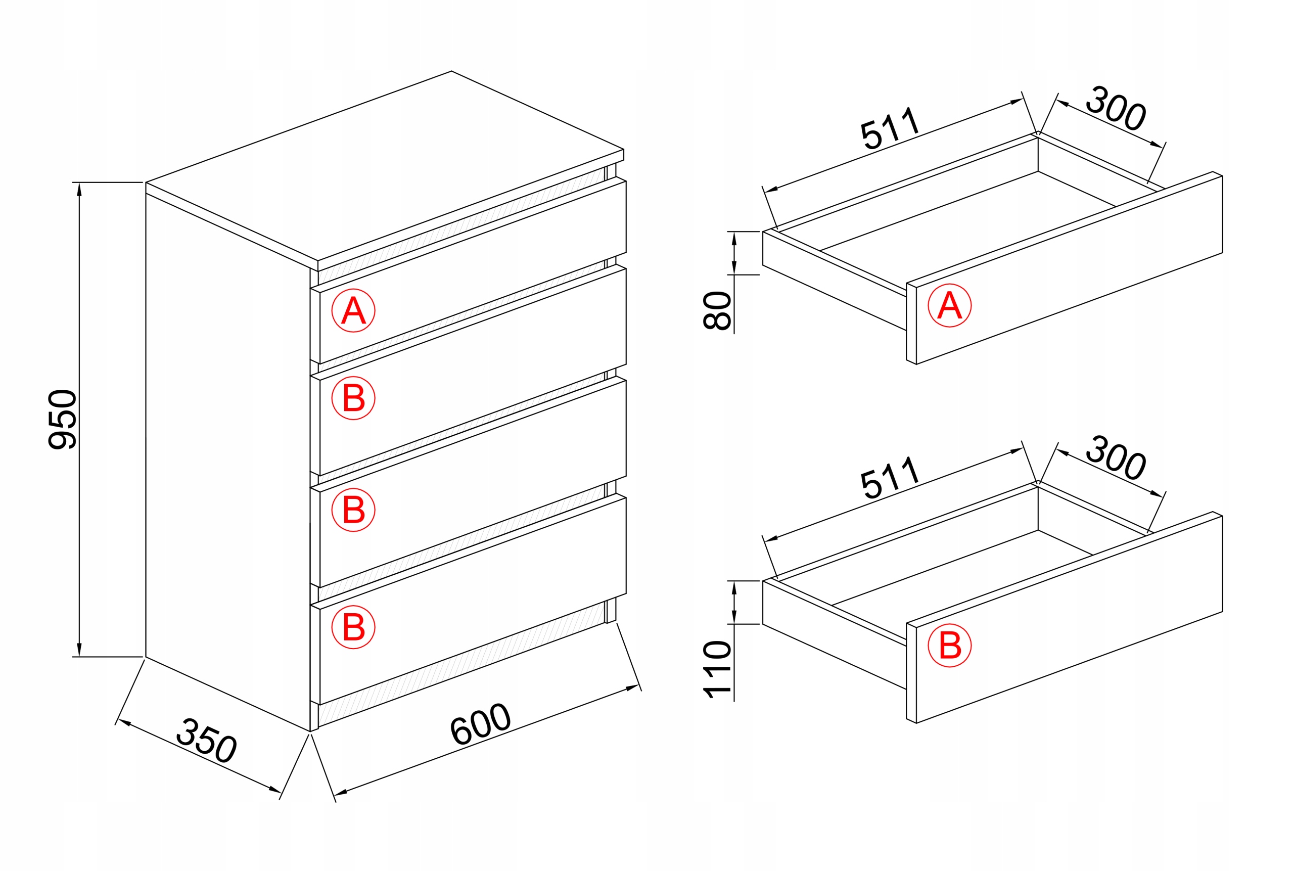 Wyposażona w cztery szuflady, z czego trzy są identyczne, a górna jest mniejsza, oferuje idealne miejsce do przechowywania ubrań, akcesoriów i innych drobiazgów. Solidna konstrukcja z płyty laminowanej zapewnia trwałość, a matowe wykończenie dodaje meblowi wyjątkowego uroku.