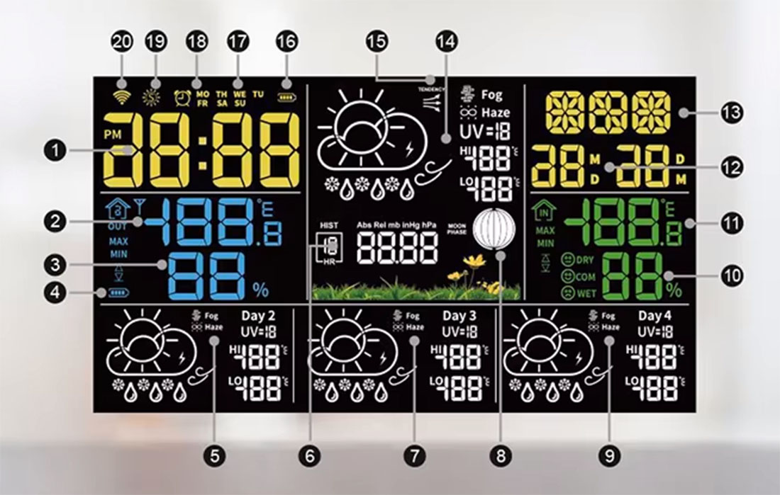 ☑️ Dzięki zaawansowanej technologii i połączeniu z aplikacją TUYA, oferuje wygodny sposób śledzenia temperatury, wilgotności, ciśnienia powietrza, fazy księżyca, czasu, kalendarza oraz prognozy pogody na najbliższe 4 dni.