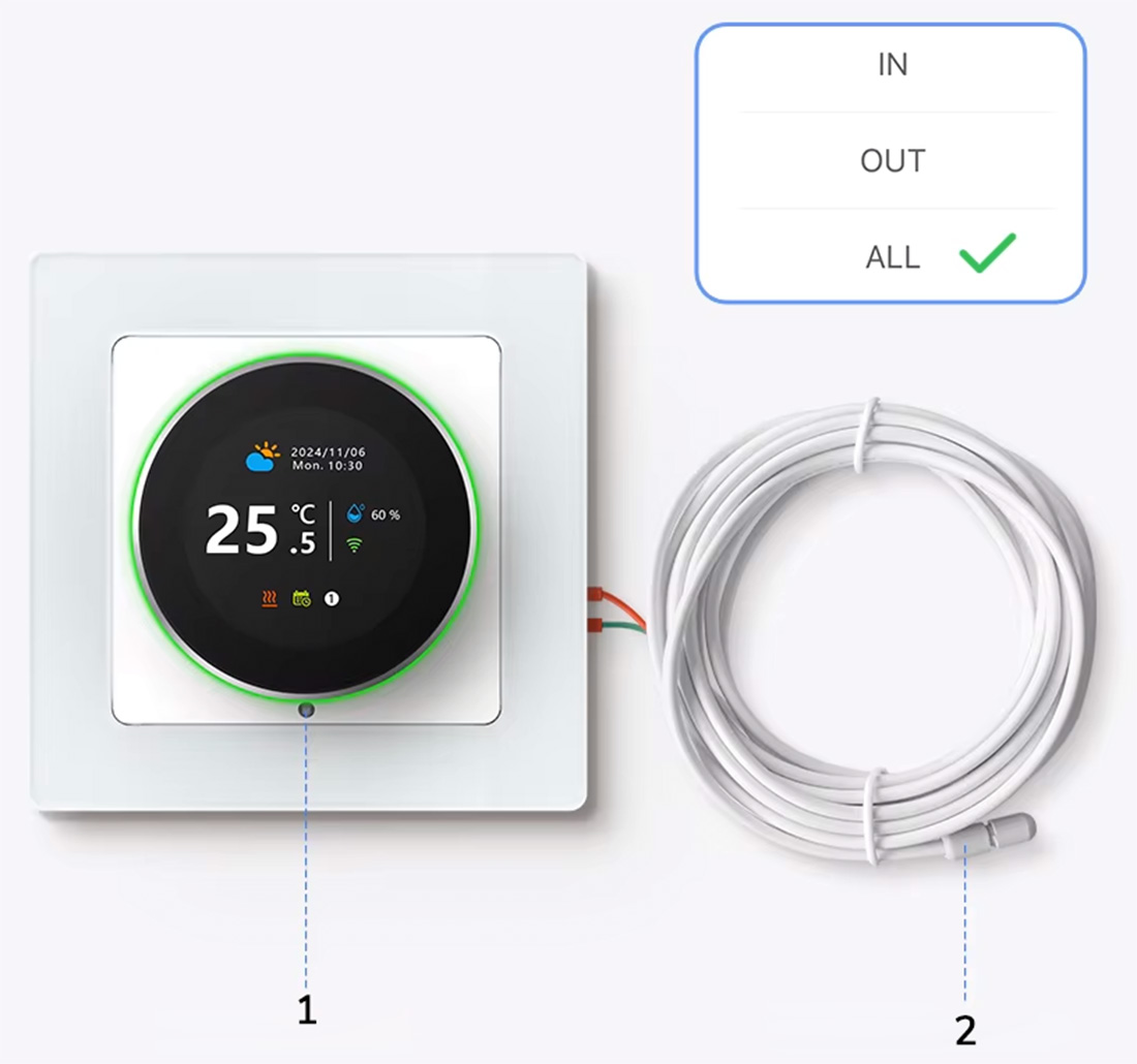 ✅ Wybór czujnika temperatury: możliwość wyboru czujnika wewnętrznego, zewnętrznego lub korzystania z obu jednocześnie