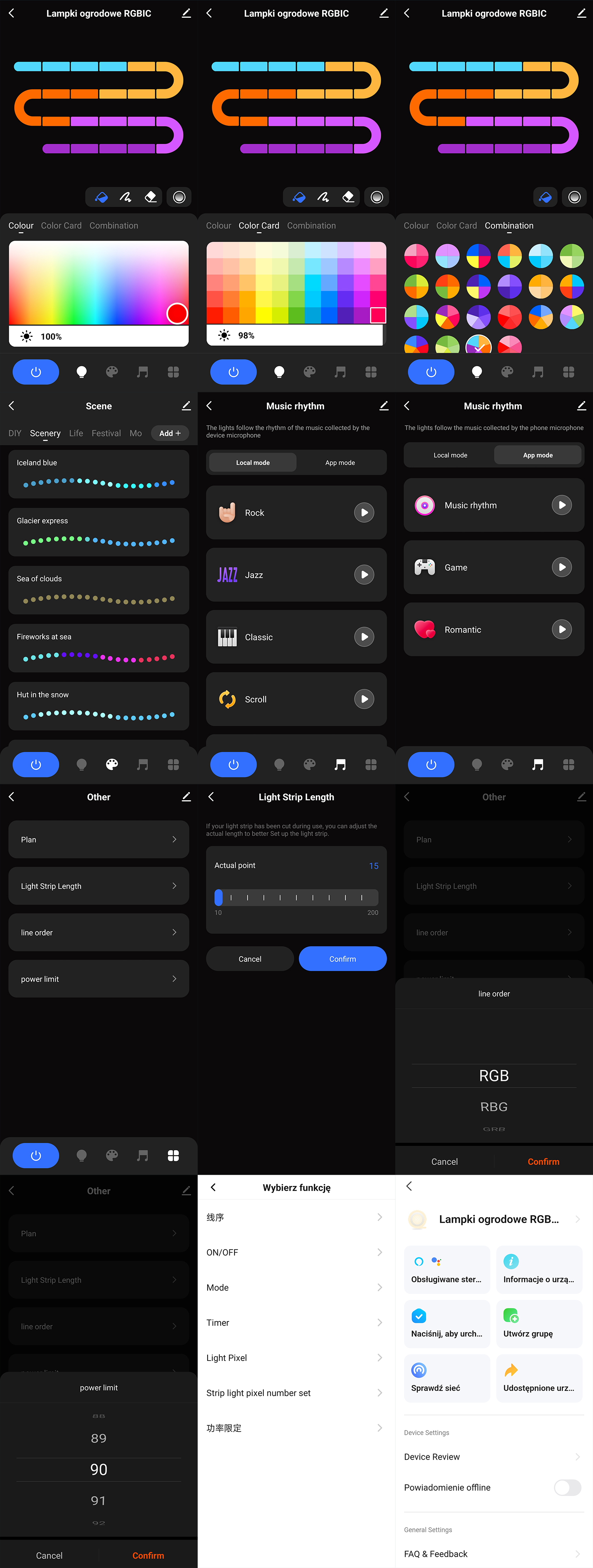 Kontroler po podłączeniu do aplikacji TUYA pozwala na ustawianie odpowiedniego koloru (lub przygotowanych wcześniej miksów kolorów, efekty płynące, rozświetlające, migające, kolory stałe), możesz wybrać jaki kolor mają mieć poszczególne lampki, przygotowane sceny (możliwość tworzenia własnych) oraz świecenia względem muzyki.